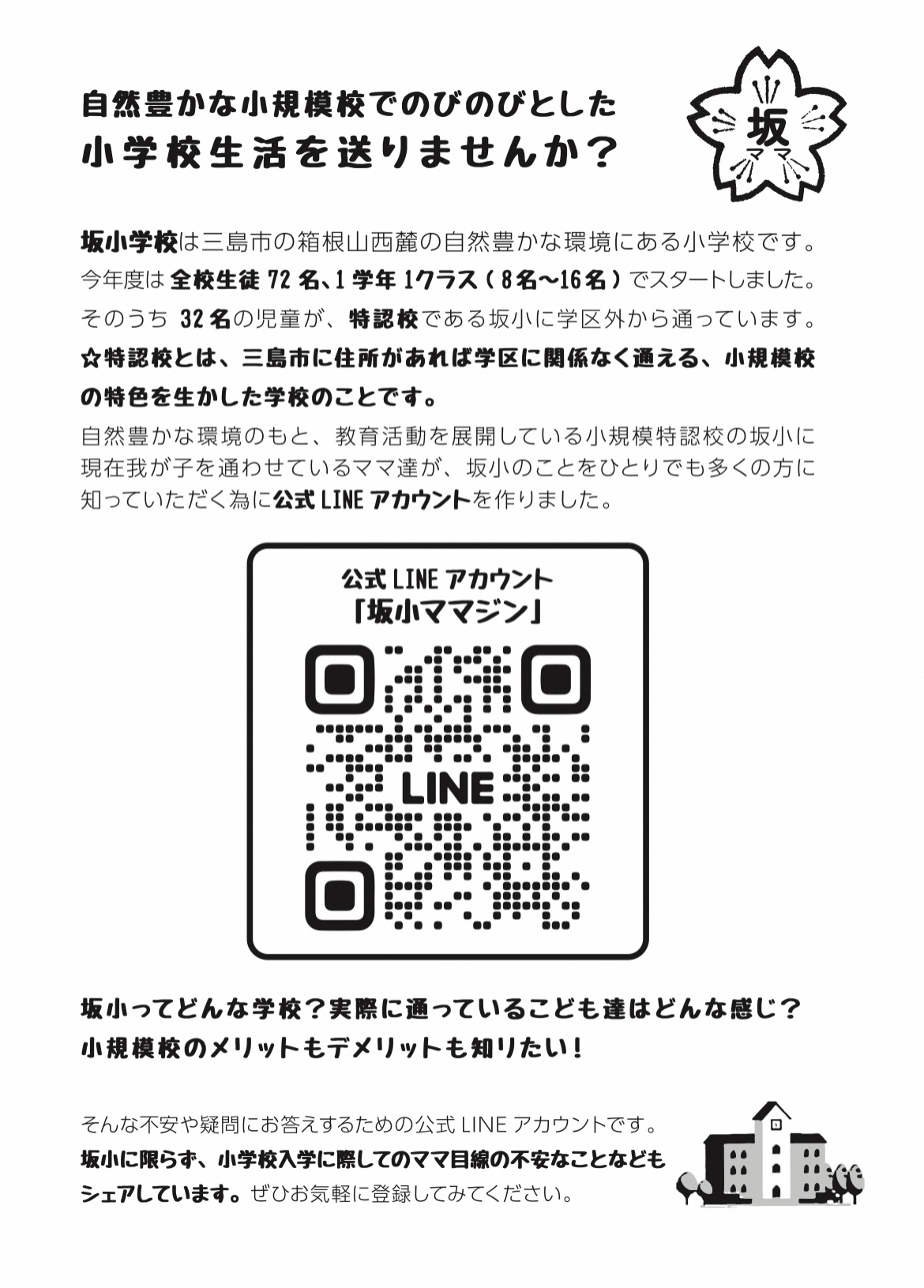 実際に通っている子どもたちはどんな感じ?小規模校のメリットもデメリットも知りたい!!そんな不安や疑問にお答えするために、坂小に我が子を通わせているママ達が、公式LINEアカウントを作りました。お気軽にご登録ください。