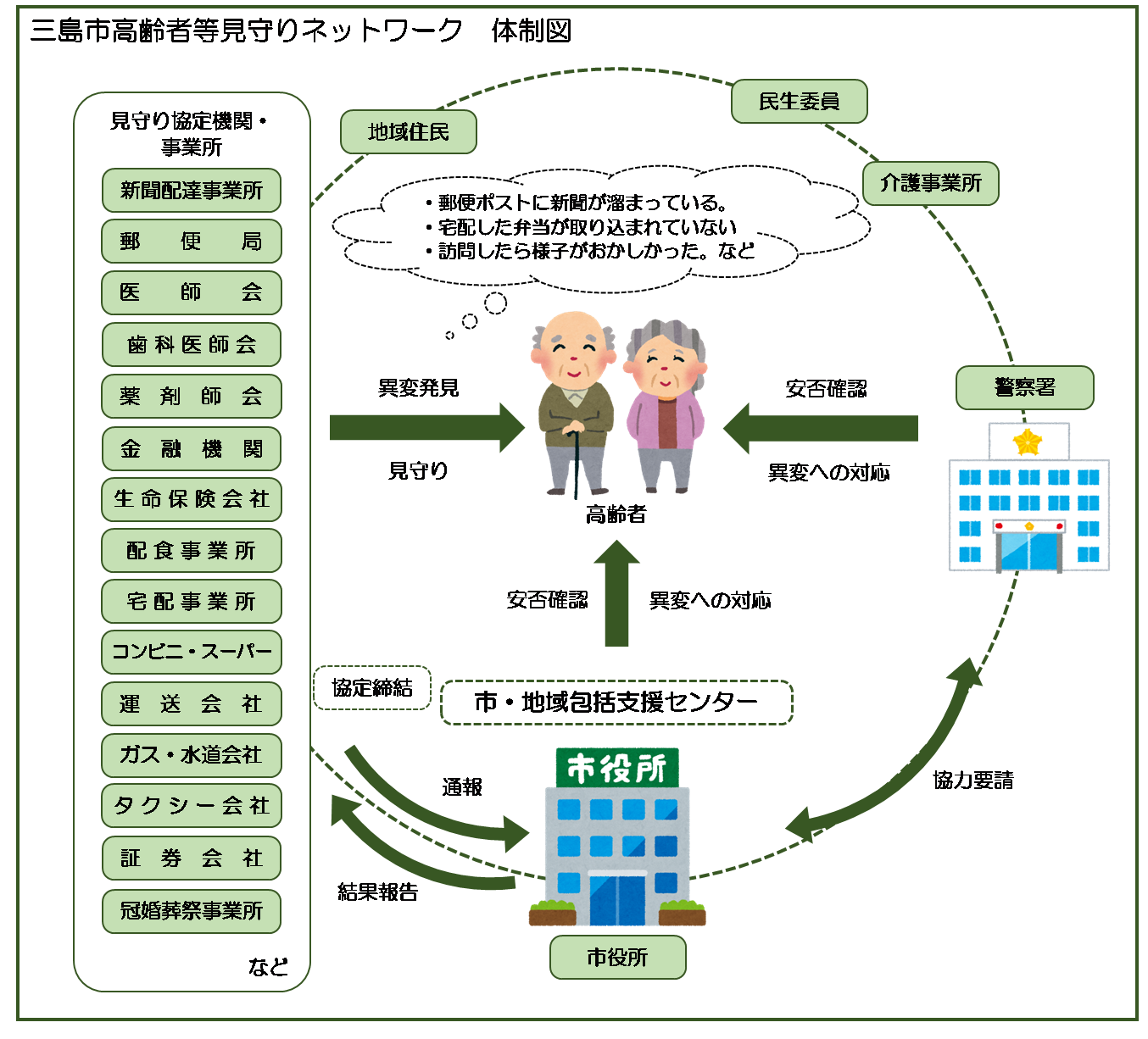 協定締結先の民間事業者等が、日頃の業務において高齢者等の様子に異変を感じたら、三島市長寿政策課地域包括支援係に連絡します。