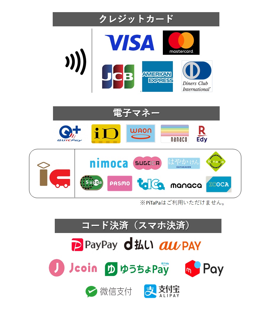 現金もしくは下記キャッシュレス決済でのお支払いが可能です。